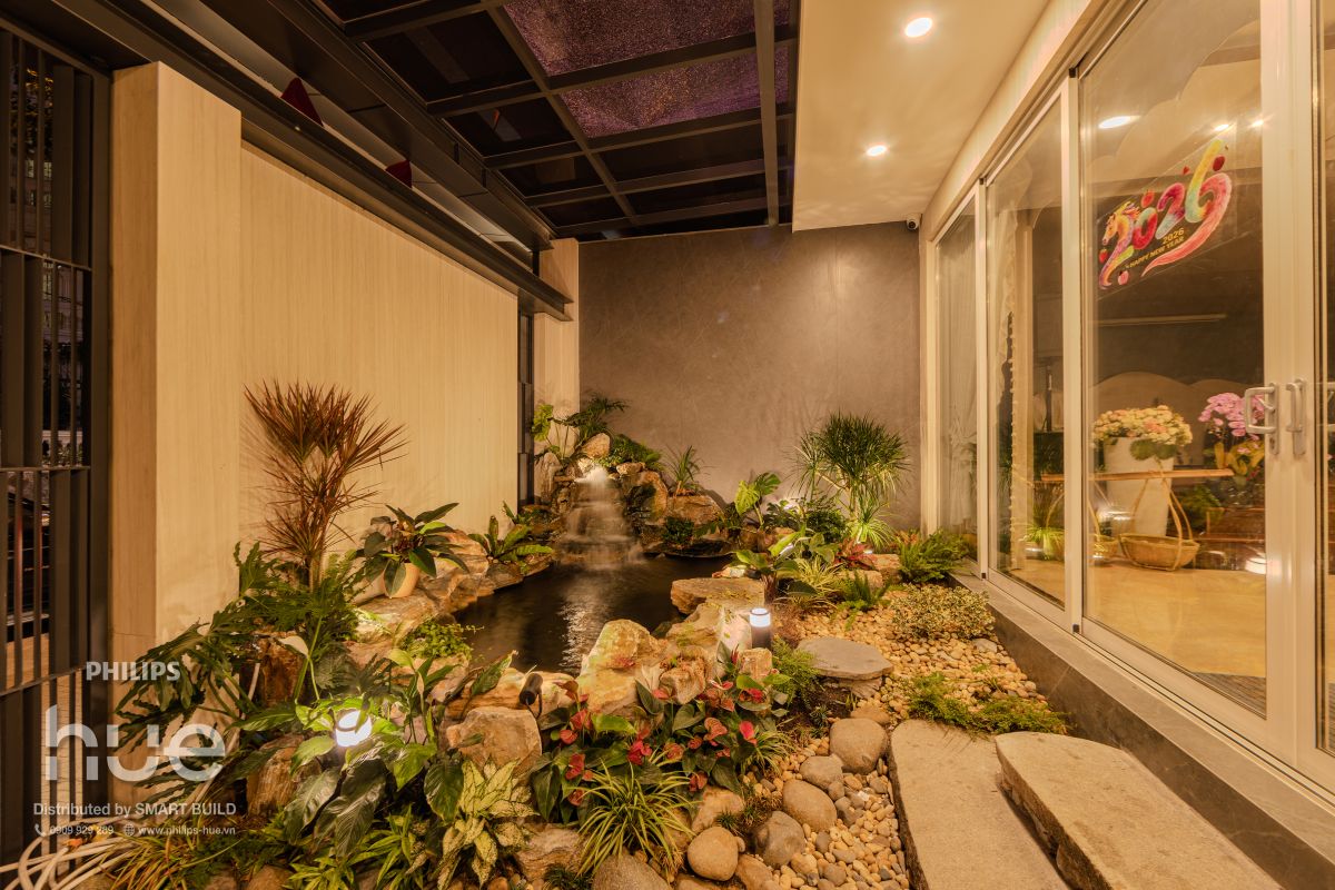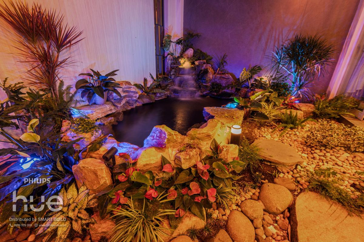 Giải pháp Philips Hue trong thiết kế garden landscape được cấu hình theo nguyên lý phân lớp ánh sáng (layered lighting), kết hợp các kỹ thuật như grazing, uplighting và spotlighting nhằm tôn vinh hình khối thực vật và vật liệu cảnh quan. Hệ thống cho phép lập trình linh hoạt các kịch bản ánh sáng (lighting scenes) theo thời gian thực, vừa đảm bảo tiêu chuẩn chiếu sáng và vận hành cho không gian ngoại thất, vừa biến khu vườn thành một không gian trải nghiệm giàu cảm xúc—nơi mỗi ngày đều mở ra những sắc thái ánh sáng mới, tựa như lạc bước giữa những khu vườn không ngừng biến đổi.