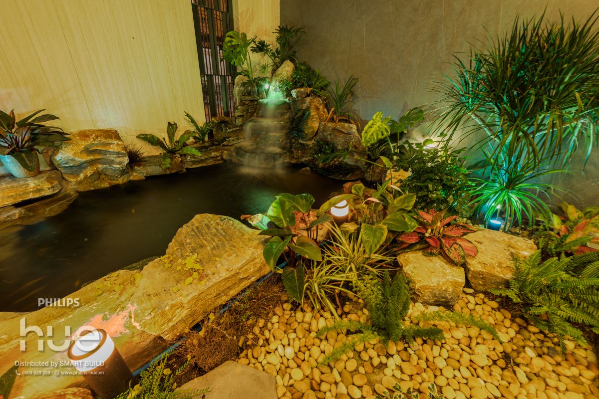 Giải pháp Philips Hue trong thiết kế garden landscape được cấu hình theo nguyên lý phân lớp ánh sáng (layered lighting), kết hợp các kỹ thuật như grazing, uplighting và spotlighting nhằm tôn vinh hình khối thực vật và vật liệu cảnh quan. Hệ thống cho phép lập trình linh hoạt các kịch bản ánh sáng (lighting scenes) theo thời gian thực, vừa đảm bảo tiêu chuẩn chiếu sáng và vận hành cho không gian ngoại thất, vừa biến khu vườn thành một không gian trải nghiệm giàu cảm xúc—nơi mỗi ngày đều mở ra những sắc thái ánh sáng mới, tựa như lạc bước giữa những khu vườn không ngừng biến đổi.